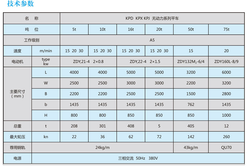電動平車是一種有軌廠內(nèi)運(yùn)輸車輛,具有結(jié)構(gòu)簡單,載重量大,耗能小,使用方便,維修容易,不污染環(huán)境等優(yōu)點(diǎn),廣泛用于機(jī)器制造,造船,冶金等工廠作為配合吊車運(yùn)移重物過跨之用。電動平車分KPJ拖纜系列、KPD低壓供電和KPX蓄電池供電的電動平車三種,這三種平車的高度低,臺面強(qiáng)度好,維修方便,可以在彎道或直道上長距離運(yùn)行,也可實(shí)現(xiàn)遙控地面控制,給廠區(qū)運(yùn)輸、搬運(yùn)以很大的方便。