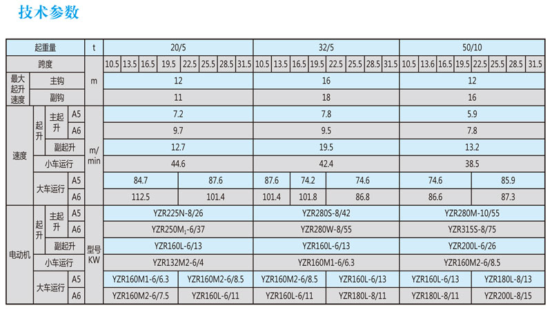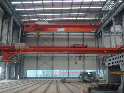 QD型吊鉤橋式起重機(jī),主要由橋架、大車運(yùn)行機(jī)構(gòu)、小車、電器設(shè)備等組成。根據(jù)使用頻繁程度不同,分為A5、A6兩種工作級(jí)別。起重量為5-120T,跨度為7.5-35.5米,工作級(jí)別為A5—A6,工作環(huán)境溫度為-25℃--40℃。